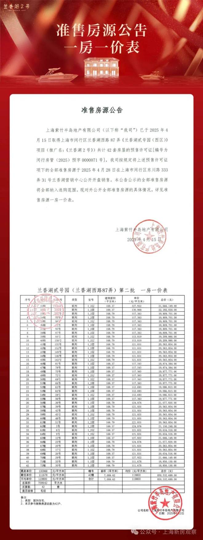 最新消息!闵行紫竹「兰香湖贰号」西区二批次均价11.98万/㎡;42套170户型的最后一批房源!已于4.28开盘销售,剩最后7席!项目本身容积率仅约0.6,是闵行滨江第一个游艇豪宅,全屋精装交付,均为国际一线大牌,堪称豪宅典范;花园面积:70-120㎡(除特殊户型外,每户均带水岸码头!