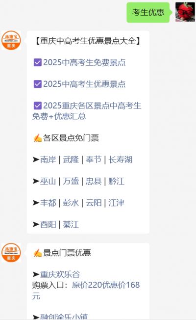 温馨提示:微信搜索公众号【重庆本地宝】,关注后发送【考生优惠】查询2025重庆中高考生哪些景点免门票,考生专享景点优惠(乐和乐都60元、渝乐小镇套票79元...),其他景区优惠、水上乐园/漂流等攻略。