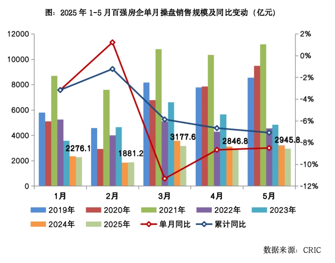 2025年1-5月,中国房地产市场整体延续止跌回稳态势。TOP100房企5月单月实现销售操盘金额2945.8亿元,环比增长3.5%。1-5月累计实现销售操盘金额13127.5亿元。