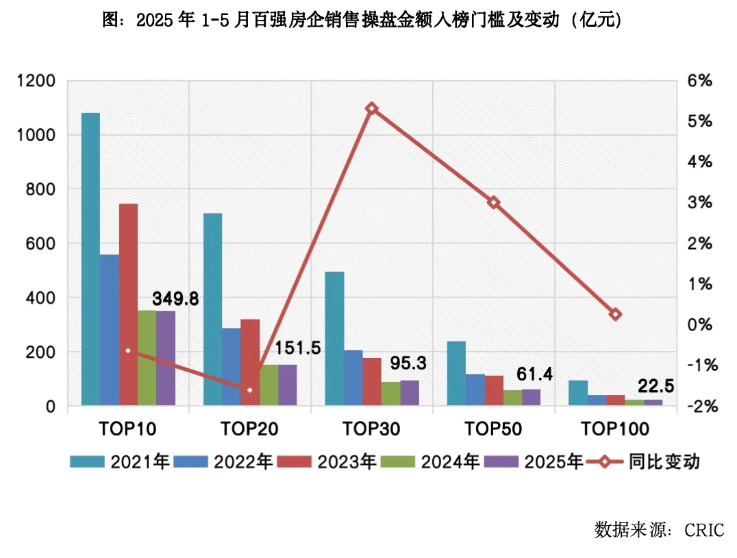 从百强房企规模门槛来看,2025年5月TOP30房企销售操盘金额门槛同比增长5.3%至95.3亿元。TOP10、TOP20房企的销售操盘金额门槛则略有降低。