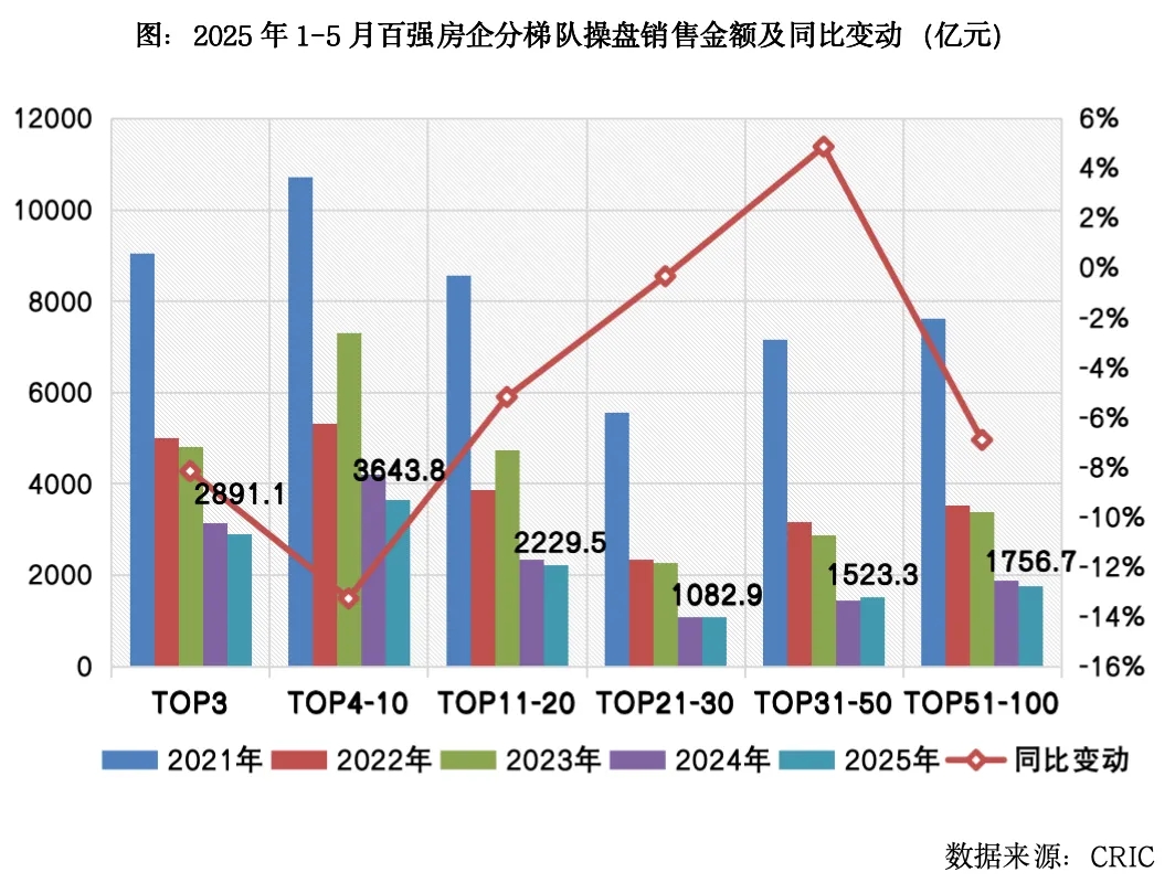 具体分梯队来看,2025年1-5月百强房企各梯队销售规模变动分化。其中,TOP31-50梯队房企的累计销售规模同比提升。而TOP10、TOP11-20和TOP51-100梯队房企销售规模则同比降低。