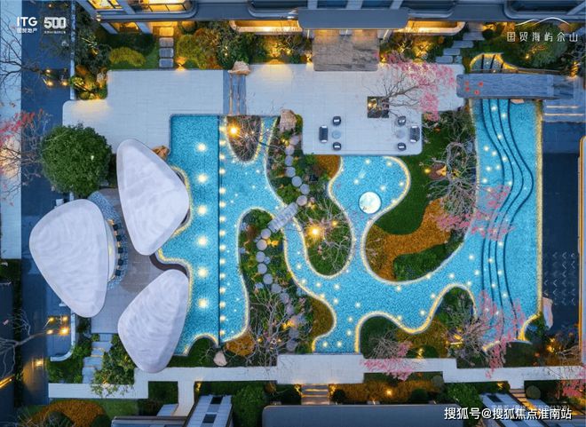 踏入中央景观区,映入眼帘的是一座占地大约1600平方米的度假酒店岛屿。岛内生长着约50年历史的乌桕树,营造出海岛风情的层叠水池和细水长流,勾勒出一种优雅放松的生活氛围。三套海上花园风格的廊架,其设计灵感来源于海洋贝壳,为林间休闲空间增添了一份独特魅力。