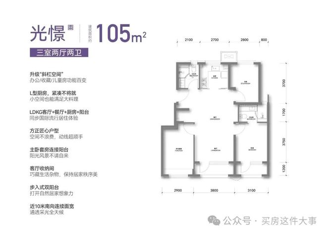 105户型是主力户型,三面朝南,客厅面宽3.8米,通透性好,全明格局,有1.2米的阳台,得房率88%。