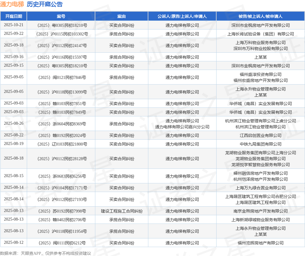 根据统计,近一年内以通力电梯有限公司为当事人的历史开庭公告有289则,其中案由为“买卖合同纠纷”的公告以159则居首,其次为“承揽合同纠纷”有39则,“合同纠纷”有26则。历史开庭公告(前20条)如下: